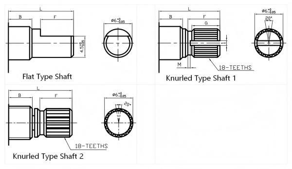 Shaft Configuration: Diverse shafts (Flat , Knurled Type, etc.)