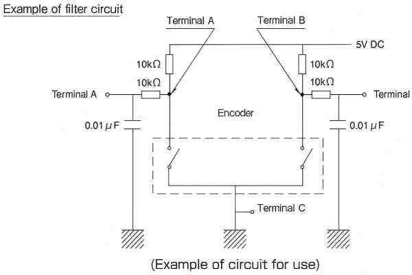 When designing the pulse count for encoders, it is necessary to take into account factors such as operating speed, sampling time, and masking time. These parameters must be verified prior to encoder application. For your pulse count design, we recommend integrating C/R filters into your circuit as illustrated below.